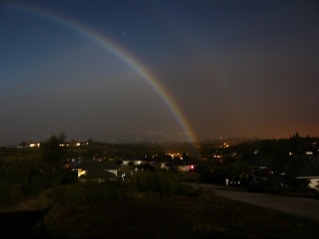Es difícil distinguir los colores en un arco iris lunar porque la luz es generalmente demasiado débil para excitar los conos receptores de colores del ojo. Sin embargo, las cámaras fotográficas sí son capaces de captar los distintos colores.